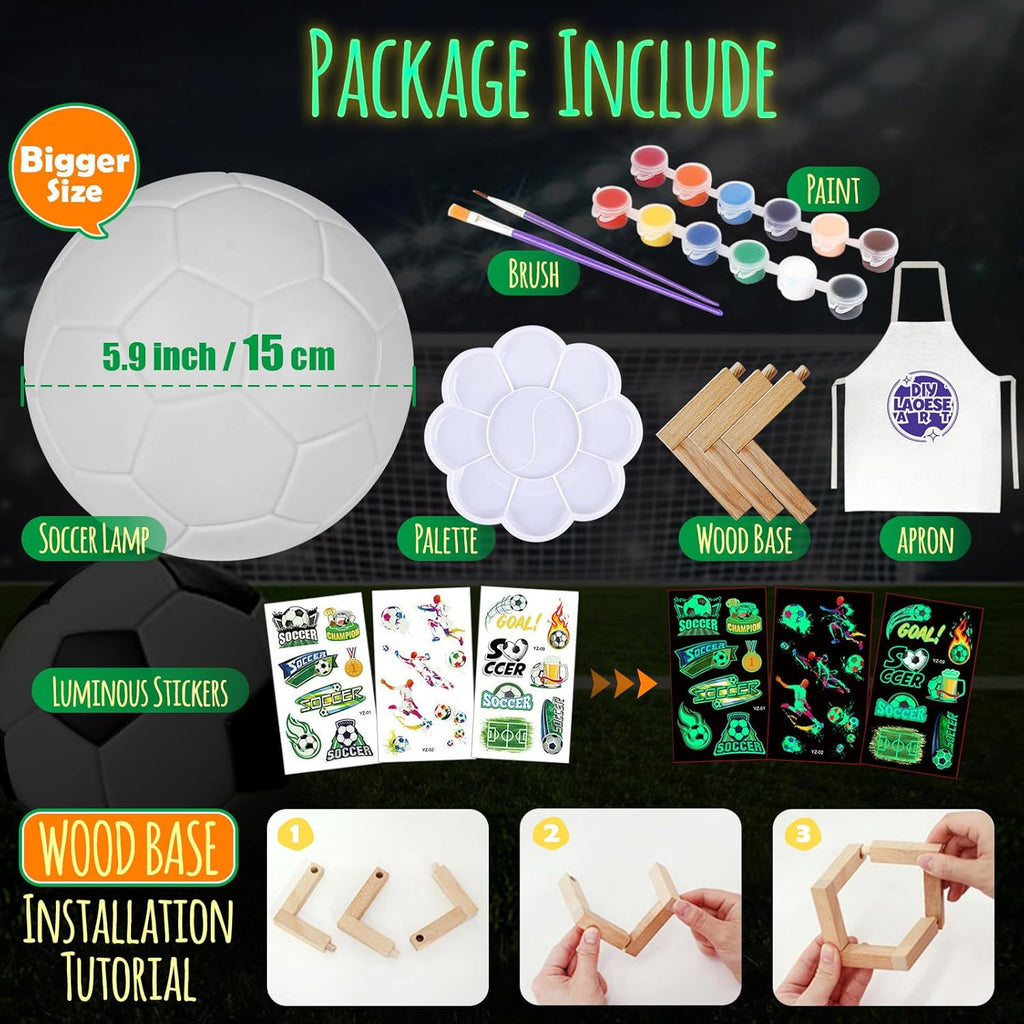 • COMPLETE TOOL SET: The craft set includes a blank football lamp, wooden base, 12 paint pots, 20+ glow in the dark stickers, and instructions for mixing colors. Get creative and color your own night light with the colors you want.
