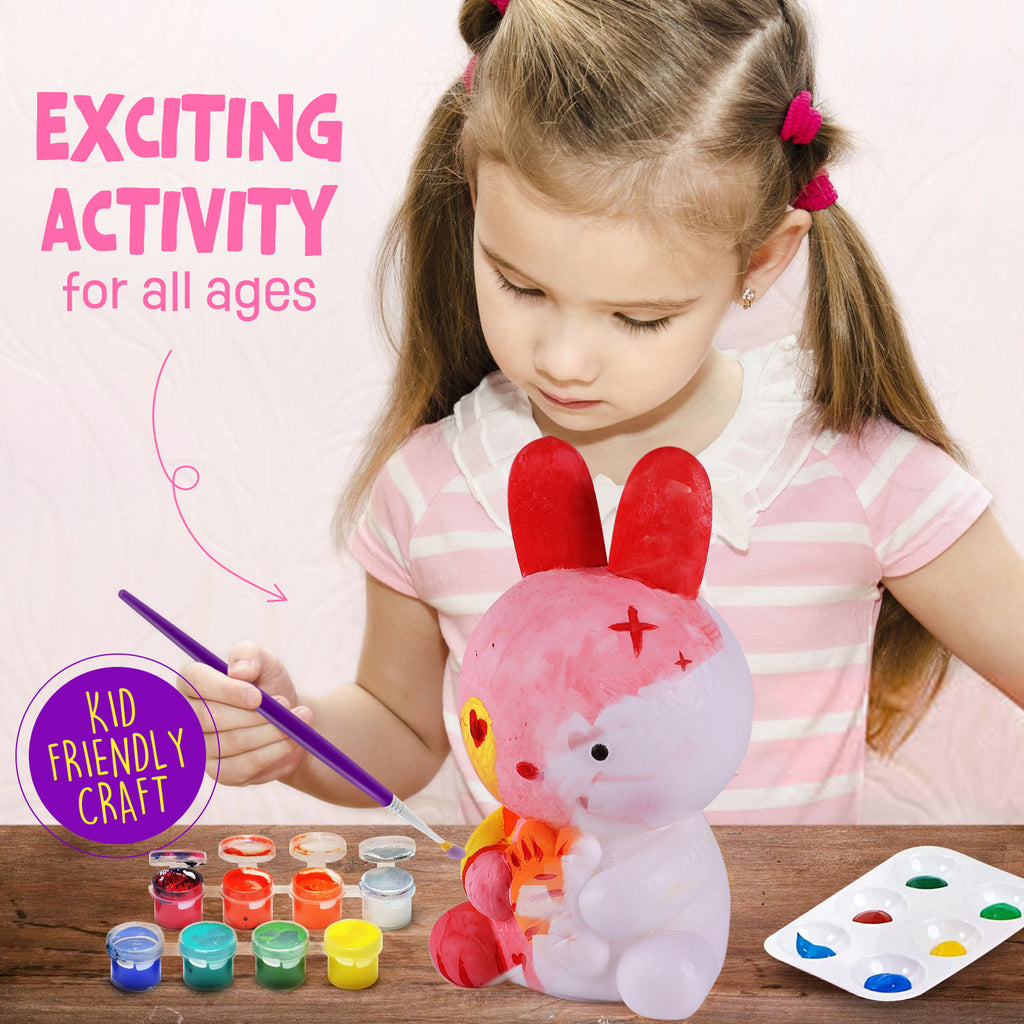 • PAINT AND CREATE YOUR OWN BUNNY LAMP KIT: The craft set includes bunny Lamp, 12 Paint Pots, 2 brushes,1 palette, 1 apron and instruction manual. Great value for educational coloring toys suitable for kids ages 6-14, and providing a fun and enriching experience as a complete art kit.